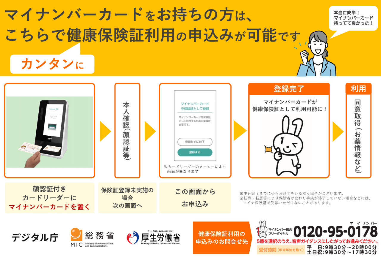 - マイナポータルにて、事前にマイナンバーカードの健康保険証利用登録を済ませておく